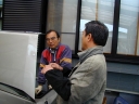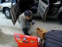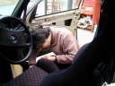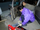 ドアにSP−300を取付中のイソジンさん。