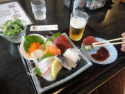 『道の駅くじ』の食堂で、ビールと刺身。